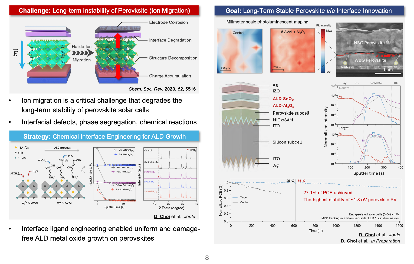 Our group develops ALD-engineered interlayers optimized for perovskite-based tandem solar cells. By suppressing ion migration, tailoring energy band alignment, and enhancing long-term durability, we achieve record efficiencies with improved operational stability. This research bridges fundamental interface chemistry with scalable thin-film processing. In doing so, we aim to accelerate the commercialization of highly stable tandem photovoltaics for future renewable energy systems.