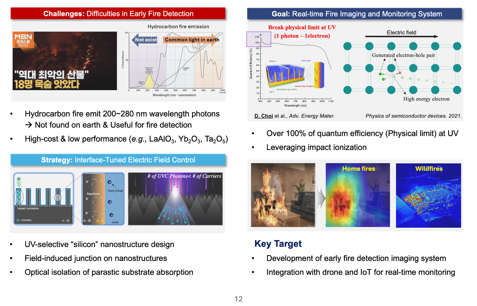 We design real-time fire imaging systems that leverage solar-blind ultraviolet detection to capture unique photon signatures from combustion. By integrating ALD-enabled junction engineering and nanostructured semiconductors, we enhance quantum efficiency beyond physical limits. This approach allows the development of lightweight, high-sensitivity imaging platforms. In the long term, our vision is to integrate these systems with drones and IoT technologies for proactive wildfire monitoring and disaster prevention.